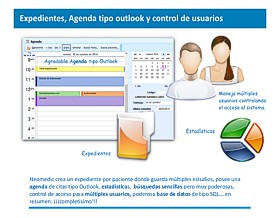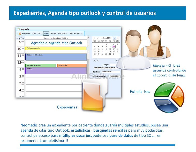 Ademas, integra un completo expediente clínico: consultas, recetas, calculadora, cargos y cobros.